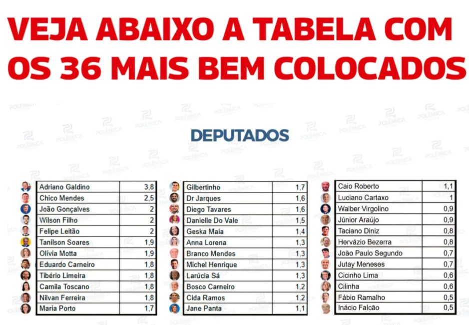 O deputado estadual Chico Mendes (PSB) segue em ascensão e consolida seu nome entre as principais lideranças políticas da Paraíba. De acordo com o terceiro levantamento do Instituto SETA, divulgado nesta quinta-feira (9), o parlamentar aparece na segunda colocação na disputa pela Assembleia Legislativa da Paraíba (ALPB) nas eleições de 2026, ficando atrás apenas do atual presidente da Casa, Adriano Galdino (Republicanos).