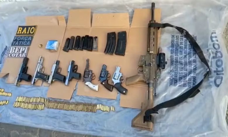 Com o bando, os policiais apreenderam oito armas de fogo, sendo um fuzil, quatro pistolas, três revólveres, além de mais de 150 munições e drogas.